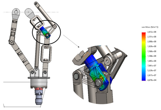 The simulations conducted took into account the forces acting on the tool tip and assumed that these forces are evenly distributed, with 3 kN in the vertical direction (z-axis) and 1 kN in both horizontal directions (x-axis and y-axis). Additionally, it was considered that the parts are made of EN10083:C45 steel, which is a type of medium-carbon construction steel. During the simulation, the tool holder and, consequently, the machine arms were moved to the critical locations of the workspace, which correspond to the four corners of the trapezoid, following the sequence shown in Figure 16 through the rotation provided by the motors. These critical points were verified when defining the machine’s architecture.