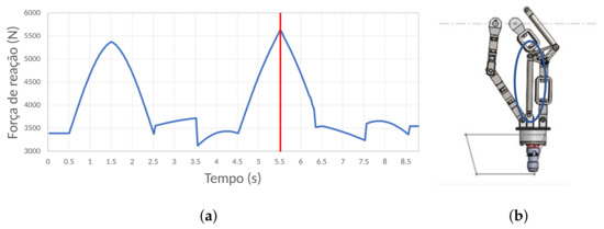 The component called “fork with pin” is acquired in its final form of acquisition, and the main concern is ensuring that the force or stress to which this component is subjected does not exceed the specifications provided by the manufacturer. It is important to note that the component in question has different levels of stress on each side of the robot due to the asymmetry present in the device. Therefore, to ensure the proper functioning of the robot, it is crucial to examine both cases. Figure 17 shows the temporal variation in the exerted force and the position where it is maximum.