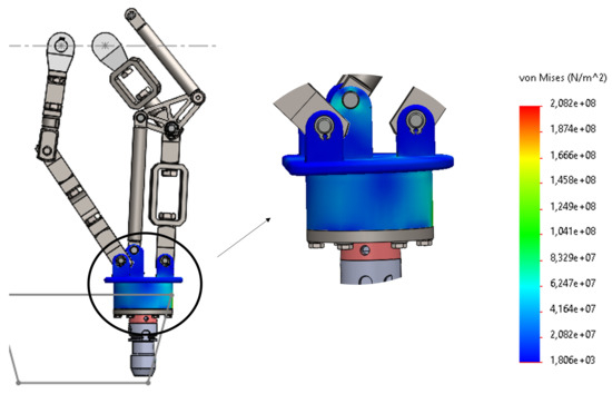 Another component to be produced is the platform. This piece is crucial for the operation of the machine. The potentially critical points are located at the connections with other components. Therefore, the reaction forces at these locations will be the same as those seen for the universal coupler and the large parallel bar components. With that being said, a simulation was performed during the time interval from 5.4 to 5.6 s, and the results are presented in Figure 21.