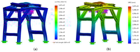 Results of the static simulation of the structure for (a) stress and (b) displacement fields.
