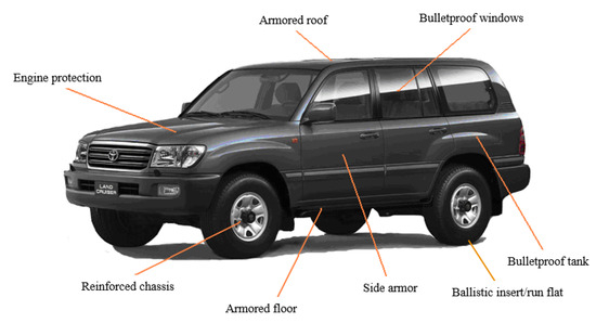 For years, safety has been a crucial consideration for designers during the vehicle design stage, especially when transporting objects that are sensitive to external factors, particularly people. Phenomena observed in recent years, such as the rise in the number of mass shootings worldwide [1] and the escalation of subsequent armed conflicts, like the Iraq War or Russia’s aggression against Ukraine, increasingly emphasize the necessity to equip not only military vehicles, but also civilian passenger vehicles [2,3].