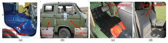 Examples of ad hoc applications of ballistic protection reinforcement: (a) protection of the interior of the vehicle cabin; (b) use of spall liner; (c) explosion-proof reinforcement of the vehicle floor; (d) possibility of protecting the seats with a flexible ballistic shield. Source: Developed based on advertising materials from Scanfiber Composites A/S.