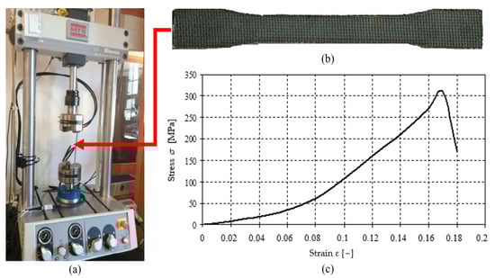 The tensile strength test results for LIM 1 are presented in Figure 4. These are averaged results from several trials. From the structure of the curve σ − ε, it can be observed that the laminate stress slowly increases as a function of deformation occurs in the initial tensile phase. Due to the nature of the weave, the load is mainly taken over by the polymer matrix. In the further part of the graph, a rapid increase in the deformation curve is noticeable, which results in an increase in the role of fabric fibers up to plastic deformation and, as a result, to the breaking.