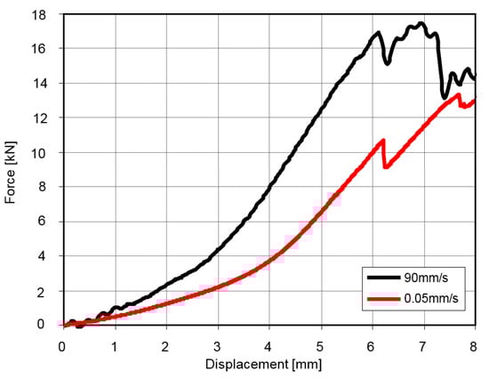In addition, tests related to the influence of damping force on the results during stretching of the analyzed samples were carried out. The tests were carried out for two tensile velocity, i.e., a minimum 0.05 mm/s and maximum 90 mm/s. The results are illustrated in the Figure 5.