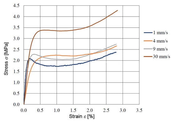 The strength tests conducted were aimed at checking the strength parameters and developing material constants for the constitutive model describing the behavior of this type of material. Strength tests were performed on a testing machine (see Figure 4a) with different strain rates. Example results are presented in Figure 6.