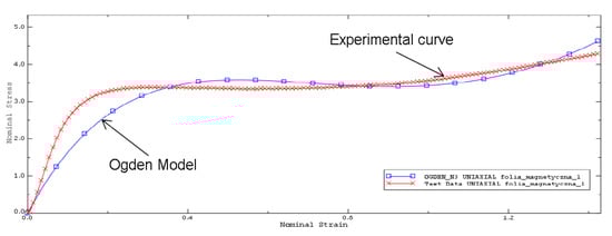 To determine the material constants of the Ogden model, ABAQUS software was used using the “Evaluate” function. On the basis of the curve from the test with the highest tensile velocity (30 mm/s), due to the closest approximation to the working conditions of the material related to the impact on ballistic impact characterized by very high velocity, it was compared with the obtained curve of the Ogden model (see Figure 7). In this way, the material constants of the model were determined, and the data are summarized in Table 2.