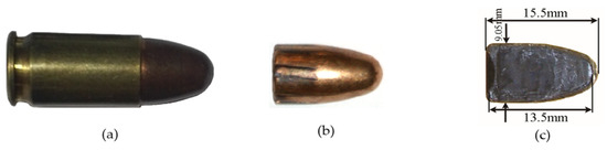 The 9 × 19 mm FMJ Parabellum pistol cartridge, which meets NATO standards, was used in the tests. Its basic parameters are listed in Table 3, and the construction is illustrated in Figure 8.