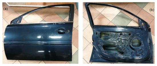 An element of the examined structure of the body plating of a passenger vehicle was the front doors from any selected car (Figure 9). The strength parameters of the car body plate have been adapted from the literature. For the exterior of cars, soft steels with a yield strength of less than 300 MPa and a carbon content not exceeding 0.3% [16] are used.