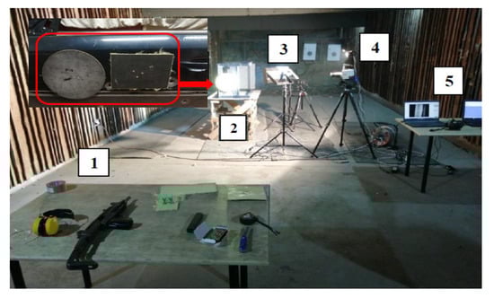 The samples mounted on the body doors were fired from the position (1) from an UZI submachine gun 5 m away from the place of attachment of samples (2). Each shot was recorded using a Phantom VEO 710 (4) high-speed camera (Vision Research, New Jersey, USA) at 42,000 frames per second. In addition to this, the firing site was illuminated with special LED lamps (3). The registration process took place directly on a PC, using special software to operate the camera on the computer (5). Examples of results from field tests are presented below (Figure 11).