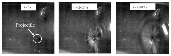 The research showed the influence of the way the shield is fixed on its ballistic properties. The shield mounted on the door with adhesive tape fulfilled its function by stopping the projectile, while the shield attached with magnetic foil let the projectile through (Figure 12). Images from the high-speed camera show that greater deflection occurred with the shield mounted with adhesive tape than with the magnetic foil solution. Hence, it can be concluded that the introduction of additional stiffening of the composite by gluing the magnetic foil on the entire surface of the shield reduced the deflection range of the composite, which in turn had a negative impact on the ballistic properties of the shield (total penetration).