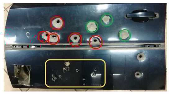 Door after shooting: bullet hole marked with red circles, deflection zones marked with green circles and the yellow marked zone represents the area not covered by the shields.