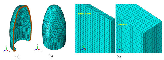 The last stage of this work was the numerical analysis of the phenomenon of the projectile hitting the designed shield. Due to the very short duration, very high velocities and nonlinear characteristics of the processes occurring during a ballistic impact, this phenomenon should undoubtedly be classified as dynamic. The most used method to describe the phenomenon is the finite element method, which is also used to solve this type of problem by computer simulation [17,18]. FEA analysis was conducted in the ABAQUS/Explicit environment. Given that the composite consists of eight layers of fabrics, holistic modelling was used. Based on this work [19,20,21,22], a model was adopted in which the structure of the shield was simplified, its dimensions were reduced and the conditions of the modeled phenomenon were simplified, for which factors such as temperature, air resistance or rotation of the projectile were not considered.