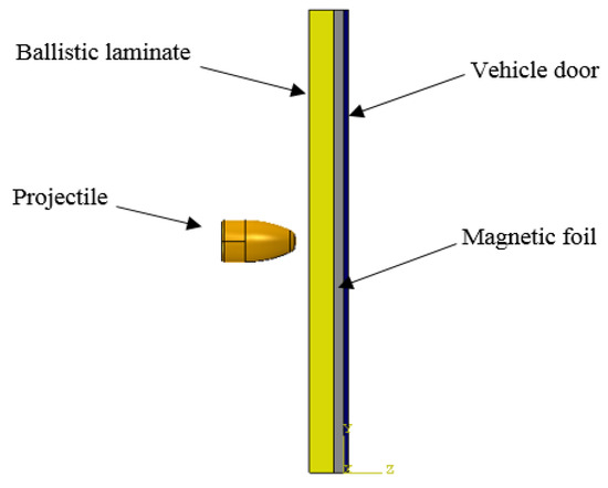The last part of the numerical analysis is the simulation of the impact of the projectile on the full ballistic package mounted on the door. The geometrical model of the considered system is shown in Figure 16.
