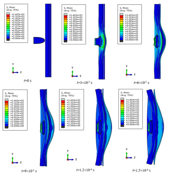 Using a caliper, the actual deflection of the sheet was measured to be 7.42 mm. Based on the adopted fitting scale, it was considered that the obtained simulation result reflects the penetration obtained by the experimental method (δ = 17.3%) to an acceptable extent. Therefore, it was assumed that the applied methodology of scaling the models is correct, and one can proceed to scaling the deformation of the projectile.