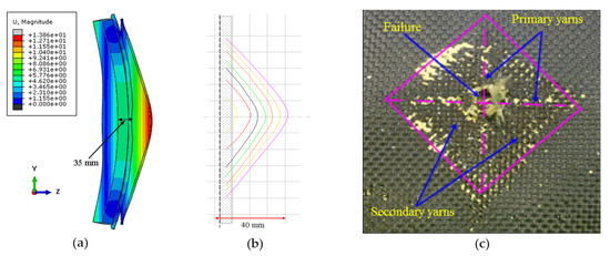 Numerical and experimental deformation analysis view: (a) numerical simulation of the deformation of the shield mounted on the tape; (b) estimated dynamic deformation from FEM; (c) one of the selected ballistic laminate layers.