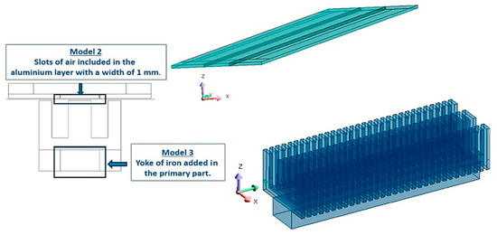 Model 1, described in [17] and represented in Figure 1, simulates a transverse magnetic flux configuration where the primary part is composed of 31 magnetic sheets with an E-shape design, whose design and dimensions are represented in the upper right part of Figure 1. The secondary part is composed of two layers where the first layer is made of aluminium and the second layer is a ferromagnetic plate, which is shown in the lower part of Figure 1. The primary part has a total length of 503.5 mm, a height of 115 mm, and a fixed width of 172 mm. The dimensions of the secondary part vary depending on the layer. Thus, the first aluminium layer has a length, width, and thickness of 990 mm, 300 mm, and 10 mm, respectively. And in the upper ferromagnetic backing, length, width, and thickness are 970 mm, 195 mm, and 25 mm, respectively.