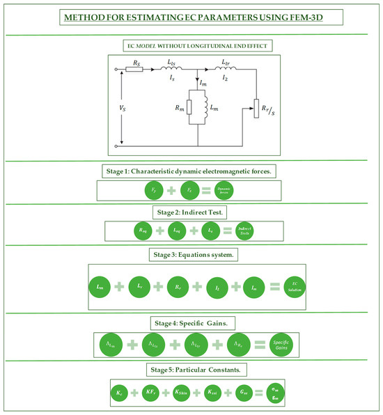 - Stage 3. System of Equations: After we simulated the indirect tests, we proposed a system of equations to determine the main EC parameters per phase. This system of equations is computed with Matlab and we consider the obtained results from the previous stages to implement it. LEE is not included, so we only analyse the following five parameters: magnetizing inductance , total secondary inductance , secondary resistance , secondary electric current , and magnetizing electric current , [18]. Using the obtained data from stages 1 to 3, we can determine the EC parameters by an accurate method. With the 3-D simulations, we considered a particular phenomenon (transversal and longitudinal magnetic fluxes operate simultaneously) of this type of LIM. This is not possible if we use a 2-D simulation. The five electrical parameters mentioned above are represented at the top of Figure 3. These parameters will be defined and discussed in Section 6. It is important to note in the graphical representation of the EC the absence of an additional parallel branch that considers the LEE by calculating two important dimensionless constants, and , [16,17].