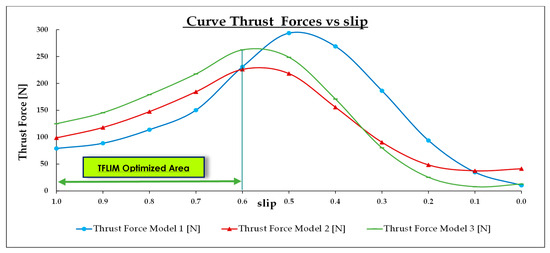 The dynamic curve of thrust force versus slip was obtained to identify speed ranges where the geometric changes introduced in the different TFLIM models are particularly significant. For the experiences, we can conclude that for slips between one () and 0.6 (), the relationship between the thrust forces is . We must remark that in secondary standstill conditions, the thrust force increases from Model 1 to Model 3 by around 60% and . This is a good result because we obtain an increase in the force with a lower power consumption during motor starting with Model 3.