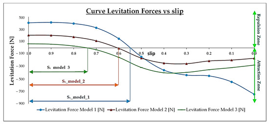 This analysis shows the advantages of adding the proposed geometric changes in Model 2 and Model 3. We analyse the evolution of two main forces, thrust force () and levitation force (). We will proceed to identify areas of optimum performance and areas where these forces do not present all the desired advantages. The behaviour of these forces during the beginning of the simulation is very important. We focused our analysis when the slip (s) varied from 1 to 0 (Table 2 shows the associated velocity to each value of the slip).