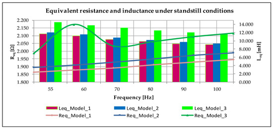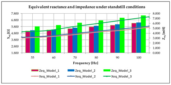 - Figure 8 represents the equivalent reactance and the equivalent impedance for each model under standstill conditions. Both parameters can be computed by Equations (11) and (12), respectively [9]. is equal to the module value of that is given by the root square of and . With the changes that we have added to the geometry, increase, so and all tests carried out give us similar results. Additionally, it is important to highlight the predominance of in comparison with , so we can establish .