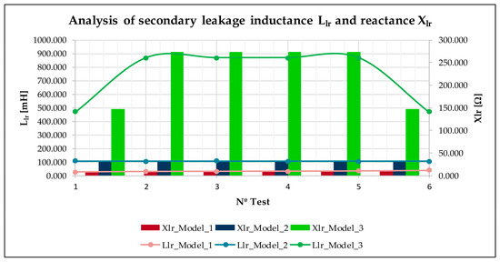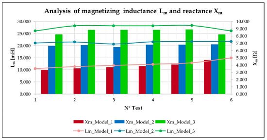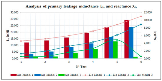 Figure 10 shows the values of . We can see that . This behaviour is similar in all proposed tests. Therefore, the central ferromagnetic yoke added below the central teeth implies an increase in the primary part inductance. If we analyse data from 8 Hz in Model 3, reaches 50.770 mH, while in Model 1 and Model 2, the values are very close to each other (47.03 mH and 47.8 mH). Additionally, to complete the whole analysis of the indirect tests, we incorporate, in Figure 10, the primary impedance obtained under no load conditions. It computed following Equations (17) and (18), where data are in Table 4. To obtain the primary impedance, we calculate the equivalent resistance per phase, , using Equation (19). There, a set of variables that describe some constructive aspects of the primary winding is described: is the average length of a single coil with a value of 526.5 mm, is the conductivity of the copper wire with a value of 2, is equal to 8 (the number of coils per phase),(mm2) is the cross-sectional area of the conductor equal to 1.7, and is the number of turns per phase equal to 22 turns.