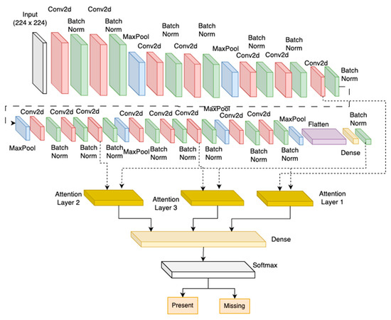 Attention Mechanism: The output of the 7th, 10th, and 13th convolutional layer has been subjected to an attention mechanism that employs a dense layer of 1 unit and SoftMax activation to obtain attention weights. The resulting attention output is obtained by multiplying the concatenated output and the attention weights. This is represented by Equations (9) and (10) in the attention mechanism equation.