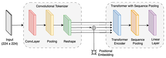 The compact convolutional transformer (CCT) is a novel architecture developed by BoltVision that effectively combines the benefits of convolutional layers and transformer-based models. This innovative approach successfully bridges the gap between the two architectures, resulting in a high-performing and efficient model [29]. The CCT’s design prioritises efficiency without sacrificing performance, making it ideal for real-time data processing applications. By integrating the strengths of both architectures, CCT provides a powerful tool for a range of tasks that require image or sequence processing. Figure 6 presents the architecture of the CCT.