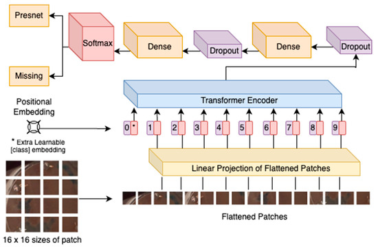 The vision transformer (ViT) implemented in BoltVision represents a pioneering architecture that leverages the transformer model’s success in natural language processing for image classification tasks inspired by previous research [14]. ViT replaces traditional convolutional layers with self-attention mechanisms, enabling the model to capture global contextual information efficiently. The architecture of ViT is illustrated in Figure 7.