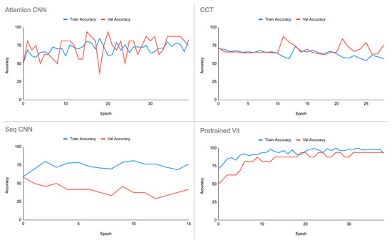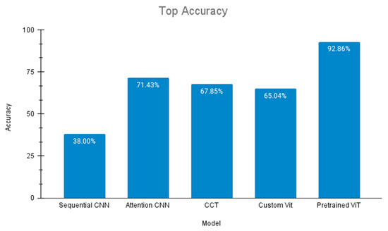 The comparative analysis between custom-designed models and pre-trained models provided valuable insights into the trade-offs associated with each approach. While custom models, such as sequential CNN and attention CNN, demonstrated reasonable performance, they required substantial training epochs to achieve competitive accuracy. On the other hand, pre-trained models, especially the pre-trained vision transformer, leveraged transfer learning to excel in accuracy with significantly fewer training epochs. The trade-offs encompass factors such as training time, model complexity, and the availability of large pre-existing datasets for transfer learning. The accuracy curve and the loss curve can be seen in Figure 10 and Figure 11.