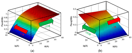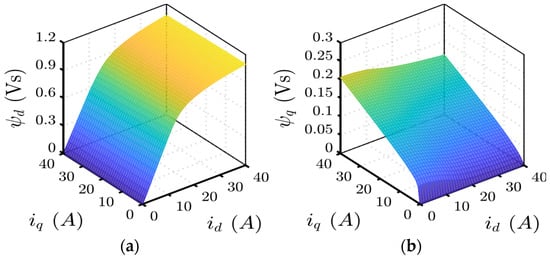 Owing to the magnetic circuit saturation effect, the dq-axis flux linkage cannot continuously increase with an increase in the dq-axis current, as analyzed by FEA, as shown in Figure 1a,b. The flux linkage entered the magnetic saturation region when the dq-axis current was large enough. In addition, owing to the influence of the magnetic cross-saturation effect, the d-axis flux linkage also declines slightly with an increase in the q-axis current, and the q-axis flux linkage is subject to the same behaviors.