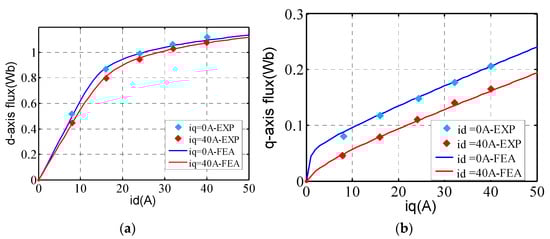 Many types of inductance and flux linkage self-commissioning methods are proposed in the literature [5,6,7,8,9,10,11], which can be divided primarily into dynamic and standstill methods. The method to correctly obtain the experimental values of flux linkage and inductance in this study is not in the scope of discussion. A detailed and time-efficient triangle current injection is discussed in [7]. The dq-axis flux linkage can be calculated from (11). The experimental results were compared with the FEA results, and the maximum normalized dq-axis flux differences are 2.8% and 8.3%, as shown in Figure 2a,b.