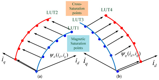 To decrease the measurement time and memory occupation, two 6 × 2 single float data LUTs (dq-axis flux-linkage) with averaged values from the experimental measurements in Figure 2 were used in practice. In this case, two 6 × 2 LUTs can only be divided into four two-dimensional LUTs. As in Figure 3, LUT1 and LUT3 only consider the effect of magnetic saturation, whereas LUT2 and LUT4 consider the impact of strong cross saturation.