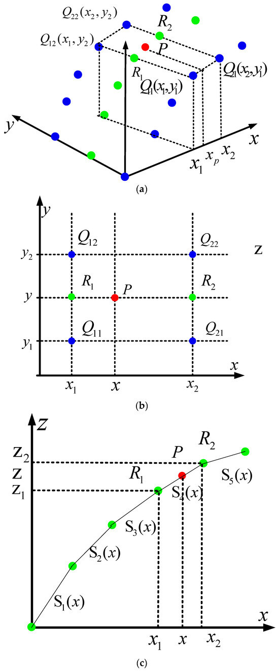 The d-axis flux linkage is detailed as an example. As shown in Figure 4a, the blue points denote the four known points listed as Q11 = z(x1,y1), Q12 = z(x1,y2), Q21 = z(x2,y1), and Q22 = z(x2,y2), while the red points denote unknown points P(xp,yp). If a value is required from the unknown function z = f(x,y) at point P(xp,yp), 3D-MLCSIM is expressed in the following steps.