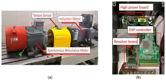 Figure 8a,b show the experimental test bench and DSP-based controller. The machine under test (SynRM 15 Kw prototype) is on the left-hand side, and the parameters are listed in Table 1. A torque transducer (Kistler 4503A200WA2B100, Winterthur, Switzerland) is mounted between the two shafts. The induction machine on the right-hand side can be used as a prime mover or dynamometer. The speed and angle were measured using a resolver (TAMAGAWA, 52AXU7102D, Nagano, Japan, TMS320F28377, DSP, Dallas, TX, USA). Digital signal processing (DSP Type: TMS320F28377, Dallas, TX, USA) was used as the core device for the controller. An RS485 communication cable was used to obtain real-time data from the DSP. The phase currents were sampled by three current sensors (Type: LEM), the DC-link voltage was also sampled, and all entered the DSP’s analog-to-digital (AD) channels.