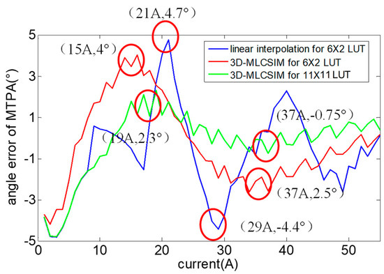 Herein, the blue line denotes the MTPA observation angle error curve constructed by the linear interpolation method under 6 × 2 LUTs (Method I), the red line indicates the MTPA observation error curve constructed by 3D-MLCSIM under 6 × 2 LUTs (Method II), and the green line denotes the MTPA observation error curve constructed by 3D-MLCSIM under 11 × 11 LUTs (Method III). As shown in Figure 10, the maximum MTPA angle error points approximately corresponded to 4.7° at 21 A for Method I, 4° at 15 A for Method II, and 2.3° at 19 A for Method III.