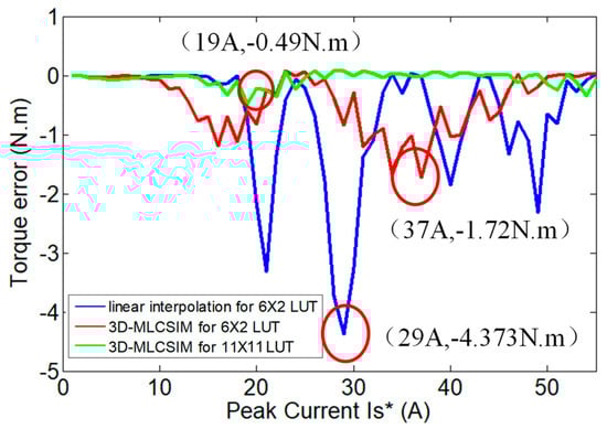 Experimental comparison for torque error in MTPA operation for proposed GSSM with 3D-MLCSIM in red (6 × 2 LUTs) and green (11 × 11 LUTs), and with linear interpolation in blue (6 × 2 LUTs).