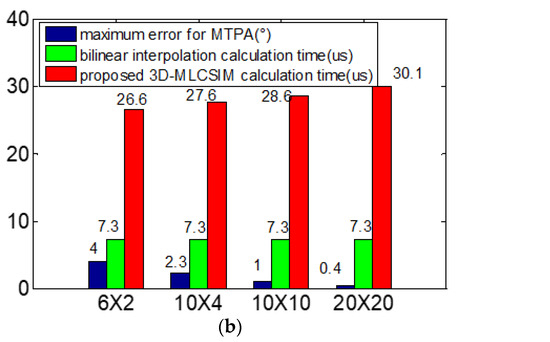 As shown in Figure 13a–c, different sizes of dq-axis flux-linkage LUTs were compared regarding memory occupation, calculation time, and time duration for the self-commissioning procedure. As shown in Figure 13a, given the single float format of data saved in DSP memory, the 6 × 2 dq-axis flux-linkage LUT only occupied 96 Bytes, as compared with 1.6 k Bytes for the 20 × 20 dq-axis flux-linkage LUT. The calculation time for the proposed 3D-MLCSIM was compared with that of the well-known bilinear interpolation method, and the results are shown in Figure 13b. The proposed interpolation time in FOC was approximately four times that of the bilinear interpolation method because the proposed interpolation exhibited higher computational complexity. The maximum MTPA error changed from 4° to 0.4° when the size of the table increased from a 6 × 2 LUT to a 20 × 20 LUT. However, the 6 × 2 LUT exhibited good agreement in the MTPA curve under most operating conditions, as shown in Figure 13c, which can be accepted in some low-cost MCUs. The two self-commissioning methods, which are denoted as ‘triangle-pulses’ in [7] and ‘square pulses’ in [8] for flux-linkage LUTs, were selected as the case study; the ‘three-triangle-pulses’ obtained the exact size of the LUT faster than the ‘three-pulse’. When the LUT was chosen as 6 × 2, only 0.4 min was required to conduct all possible points reported in [7]. The calculation time of the GSSM did not change significantly with the increasing size of the LUT because the fixed 11 iterations were used for every operating point. The total time for fast self-commissioning with a 6 × 2 dq-axis flux-linkage LUT and MTPA searching was only 31.6 s.