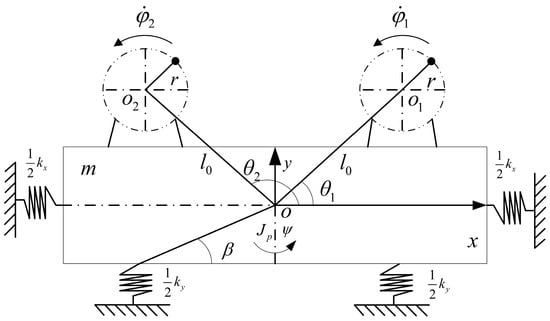 As shown in Figure 1, the vibration system is composed of the following parts from the bottom to top. Firstly, a steel frame base is fixed on the ground. Four linear springs which are symmetrically distributed about the center point o of the body are used at each of the four corners of the steel frame to support the rigid shaking table. The y-axis is the center of the symmetric placement of two induction motors. The right side is motor 1; the left side is motor 2. According to the Lagrange equation, the dynamics equation of multifrequency-controlled synchronization is shown as follows [26].