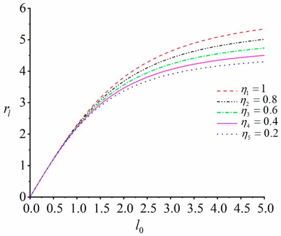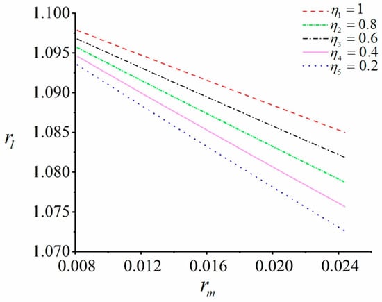 Keeping the mass of the eccentric rotor 1 constant and adjusting the distance from the two induction motors to the center of the body, we obtained the graph of as a function of . After that, we adjusted the parameter , and the graphs of eccentric rotors 1 and 2 at various masses could be obtained. As shown in Figure 3, the distance from the two induction motors to the center of the body grew farther and farther with the increasing , and increased monotonically.