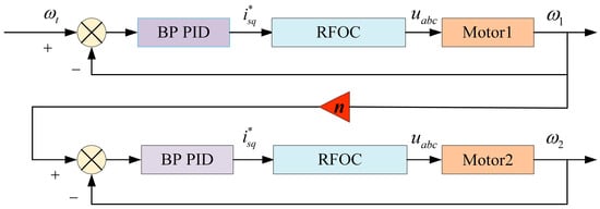 As shown in Figure 4, motor 1 is the master motor and motor 2 is the slave motor; motor 2 tracks motor 1 with a fixed speed ratio parameter n. The reason for selecting the master–slave controlling strategy was that a near-resonance phenomenon appeared firstly because of the approximate frequency between the speeds of two motors and the rigid body. This phenomenon resulted in the phase difference being unable to always keep a fixed value when the system was in the stable state. With the proposed master–slave controlling strategy, only if motor 1 worked for the former operation would the phase difference keep the same constant. The rotor flux-oriented control (RFOC) and the controlling method were introduced into the electromagnetic system. represents the target speed, which was input into motor 1 as a given speed. The stator current of the q-axis was then controlled by a modified BP PID control method to control the RFOC. In this way, the output signal of the inverter acted on motor 1, achieving a speed for motor 1. had two roles: one was to feed back to motor 1 to obtain the speed error for motor speed control adjustment, and the other was used as a speed input and transmitted to motor 2 so that the speed of motor 2 could be obtained. Similarly, the control process of motor 2 was the same as that of motor 1, as the speed of motor 2 could be obtained from motor 1. Then, through feedback, it was possible to achieve control of the rotational speed inner ring of motor 2, thus realizing the control synchronization based on the fixed speed ratio.