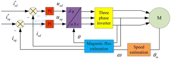 The RFOC in Figure 4 is shown in Figure 5. Because the control variable which was chosen was current, the RFOC was a current control. With the difference value between the initial speed and the feedback speed , the controlling method was adopted to acquire the electromagnetic torque , which was used to calculate the stator current on the q-axis. The input on the left in Figure 5 is the current, and on the d-axis can be derived from equation . is the target value of the initially given magnetic chain; is known for a given value. In this way, we obtained and afterwards through PI control. The synchronous magnetic chain angle could be derived from the following Equation (15):