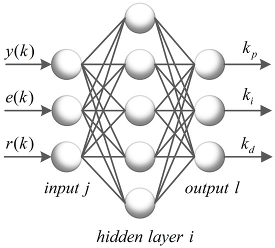 A BP neural network is a multilayer forward neural network that is trained according to the error back propagation algorithm. It can map arbitrarily complex nonlinear relationships, thus making up for the shortcomings of traditional PID controllers in the nonlinear domain. The structural block diagram of the BP neural network PID controller is shown in Figure 6. The BP neural network in this paper was designed as a 3-5-3 structure, where the input layer contained three neurons, the hidden layer contained five neurons, and the output layer contained three neurons. The given, error, and actual values of the system were used as inputs, and the three parameters, , , and , of the PID were used as outputs. The specific structure is shown in Figure 7.