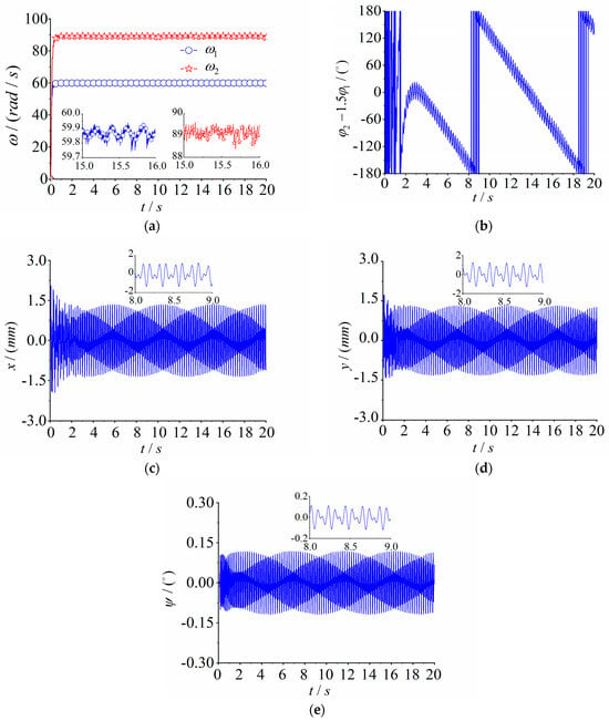 Multifrequency self-synchronization with fixed speed ratio parameter of , where . (a) Speed; (b) phase difference between motors 1 and 2; (c) response in the x direction; (d) response in the y direction; (e) response in the ψ direction.