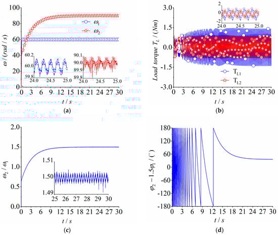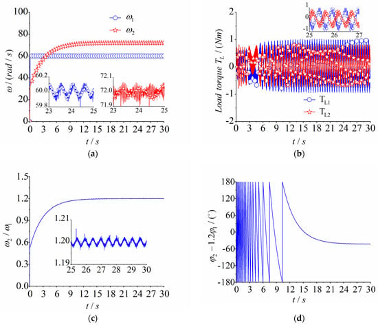 In order to prove the generality of the control method in this paper, controlled synchronization can be achieved under this dynamics model with any fixed speed ratio parameter , so the fixed speed ratio parameter was changed from 1.5 to 1.2 to obtain Figure 10. As shown in Figure 10a, the given speed of master motor 1 remained 60 rad/s. Because the fixed speed ratio parameter changed to 1.2, the speed of slave motor 2 changed to 72 rad/s. As can be seen from the enlarged graph, the speed values of both motors fluctuated up and down with their respective target values. Figure 10b shows the load torque of the two induction motors. Their values remained between −1 and 1 and did not exceed their own electromagnetic torque. This principle is the same as in the above case. The speed ratio in Figure 10c also achieved a fixed speed ratio of . The phase difference between the two excitation motors in (d) also gradually converged to a constant value. However, due to the different parameters of the fixed speed ratio, the response curves also varied accordingly, as shown in Figure 10e–g. It can be known that the control method based on this paper is able to achieve multi-frequency controlled synchronous motion with an arbitrary fixed speed ratio under the same dynamics model.