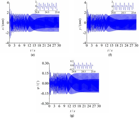 Multifrequency control synchronization on fixed speed ratio parameter , where . (a) Speed; (b) load torque; (c) speed ratio between motors 1 and 2; (d) phase differences between motor 1 and 2; (e) response in the x direction; (f) response in the y direction; (g) response in the ψ direction.