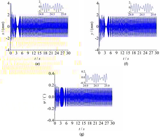 Since multi-frequency self-synchronous motion with a fixed speed ratio was not realized, multi-frequency controlled synchronous motion with a fixed speed ratio was realized by introducing an improved BP PID control method. According to the master–slave control strategy utilized in this paper, the speed control of motor 1 and motor 2 was carried out first, followed by the speed control of the whole vibration system. After the speed of motor 1 was multiplied by the fixed speed ratio parameter , we used the speed of motor 2 to track it. The simulation results are shown in Figure 9. In (a), the given speed of the main motor 1 is 60 rad/s, and the speed fluctuates in a small range after stabilization. Because of the fixed speed ratio parameter , the speed of motor 2 stabilized at about 90 rad/s. (b) shows the load torque of the two induction motors. By enlarging the graph, we can see that the load torque values of the two induction motors were between −2 and 2, which means that the load torque values of both motors were less than the electromagnetic torque; thus, they can operate normally without motor blocking or motor destruction. To further demonstrate the accuracy of the speed control, as shown in (c), it is shown that the speed of motor 2 reached 1.5 times that of motor 1, which is further proof that the fixed-speed-ratio parameter reaches . (d) shows the phase difference between the two excited motors. The value of the phase difference no longer varied constantly in the period range, but eventually converged to a constant value, which was determined by the chaotic synchronization at the initial over-resonance. (e–g) show the displacement responses of the vibrating system in three directions: , , and , respectively. It can be clearly seen that, unlike the self-synchronous motion at the same frequency, they were no longer the standard sinusoidal curves, but the result of two different frequencies superimposed on each other. Therefore, in summary, the BP PID control method in this paper has good effectiveness and robustness for realizing the controlled synchronous motion of the vibration system; the vibration system achieved multi-frequency controlled synchronous motion with a given fixed speed ratio.