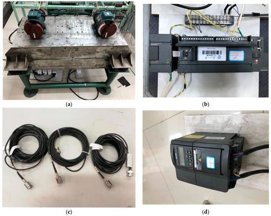In order to verify the correctness of the simulation results, verification experiments were conducted on a vibration test stand, obtaining the same results as the simulation. The fixed speed ratio multi-frequency self-synchronization of the vibration system could not be achieved. After adding a control method, the fixed speed ratio multi-frequency controlled synchronous motion of the vibration system could be achieved. The parameters of the test stand and the motor parameters were the same as those in the simulation. First, we utilized an experimental shaking table and the experimental equipment shown in Figure 11. The speeds of the two induction motors in the experiment were controlled by two inverters, and the inverter model was chosen from Siemens MM440. The master–slave structure control strategy in the vibration system was implemented using a PLC (programmable logic controller), and the PLC model was Siemens S7-200. The acquisition of phase difference and angular velocity signals was carried out by means of pulse encoders. The response of the vibrating body and the transmission of the pulses were facilitated using three acceleration sensors, data acquisition and signal processing instruments from the Oriental Institute. Hall sensors were used to measure the phase difference between the two motors.