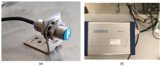 Experimental equipment. (a) Vibration test bench; (b) programmable logic controller; (c) acceleration sensor; (d) frequency converter; (e) hall sensor; (f) signal acquisition instrument.