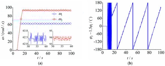 According to the literature [22], the model in Figure 1 cannot achieve multi-frequency self-synchronization. Thus, for this part of the impossibility, multi-frequency control synchronization can be achieved by adding a control algorithm to the self-synchronization. Based on the theory of nonlinear dynamics, the speed ratio of the two excitation motors in the fixed-speed-ratio synchronous motion can be expressed as , where and are prime numbers of each other. Let , , , . Then, the speed of the two excitation motors in the vibration system at this time can be expressed as