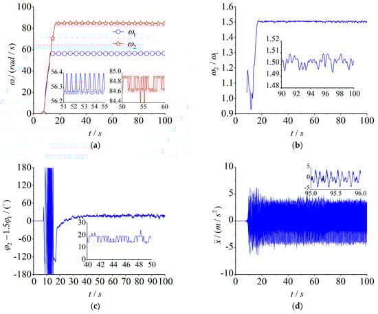 Base-frequency self-synchronization can be considered as a special case of self-synchronization at a fixed speed ratio parameter of , achieving synchronous motion when the vibration system reaches a steady state, i.e., . We can obtain the formula by transforming. Similarly, the same applies to the self-synchronous motion with a fixed speed ratio. When the vibration system reaches the steady state, i.e., , we can obtain the formula by transforming and by controlling the fixed speed ratio parameter to achieve multi-frequency self-synchronization motion with two motors. We set the frequency of the two motors to 30 Hz and 45 Hz, respectively. As shown in Figure 8, (a) shows the speeds of the two induction motors of the vibration system. The given speed of the main motor 1 was 60 rad/s. Due to the fixed speed ratio parameter , the speed of motor 2 stabilized at 90 rad/s. (b) represents the phase difference between the two eccentric rotors. From (b), we know that the phase difference between the two vibration motors was not equal to a constant, and it is obvious that the phase of motor 2 lagged behind the phase of 1.5 times motor 1. As shown in Figure 8c–e, the motor moved in cycles, so the amplitudes appeared to superimpose and cancel periodically. Finally, response curves in the form of the , , and directions appeared, revealing that the wave peak and trough values of the response curves showed non-sinusoidal trends. To sum up, it is known that the vibration system driven by two induction motors cannot achieve self-synchronous motion with a fixed speed ratio.